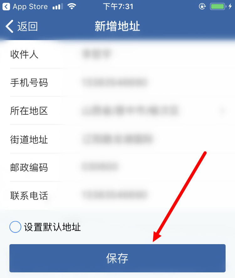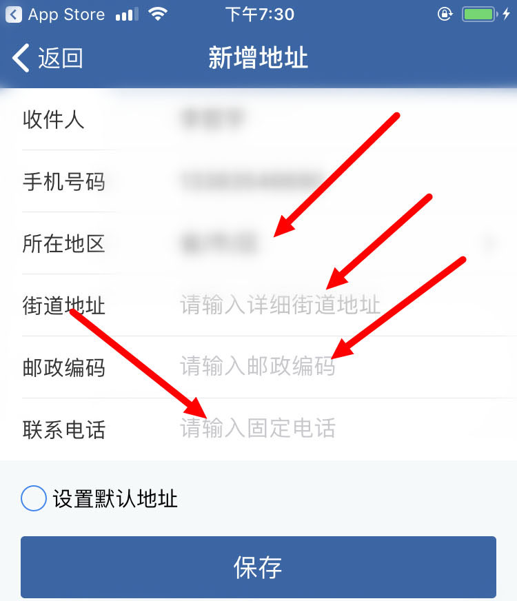 4、然后在【新增地址】的页面里,输入【所在地区】、【街道地址】、【邮政编码】以及【联系电话】。