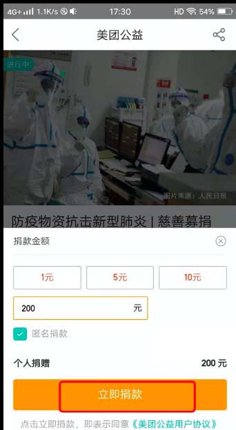 6、勾选或直接输入要捐款的金额,点击下方的“立即捐款”。