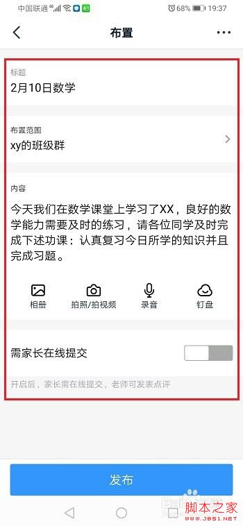 第四步选择好之后,输入布置的标题,内容,点击发布,如下图所示: