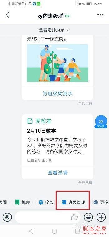 第一步手机上打开钉钉,进去班级群,点击班级管理,如下图所示: