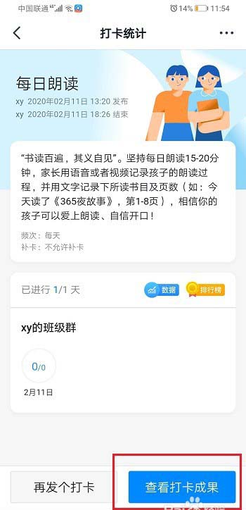 3、点击打卡任务进去,可以看到详情,如果是我们发布的话,也可以查看打卡结果,如下图所示: