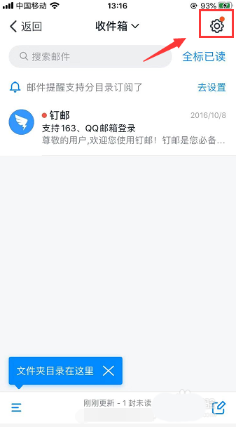 2、进入钉邮收件箱页面,点开右上角的设置,如下图