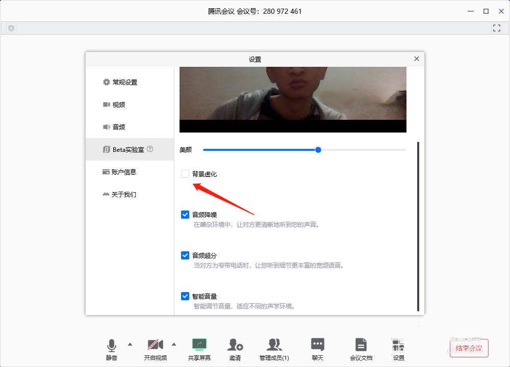 7、背景虚化功能开启后,我们人物周围的背景会被虚化,看不清楚。这样开会的时候就算开启摄像头也能保护自己的隐私,不让别人看到我们身处的环境。