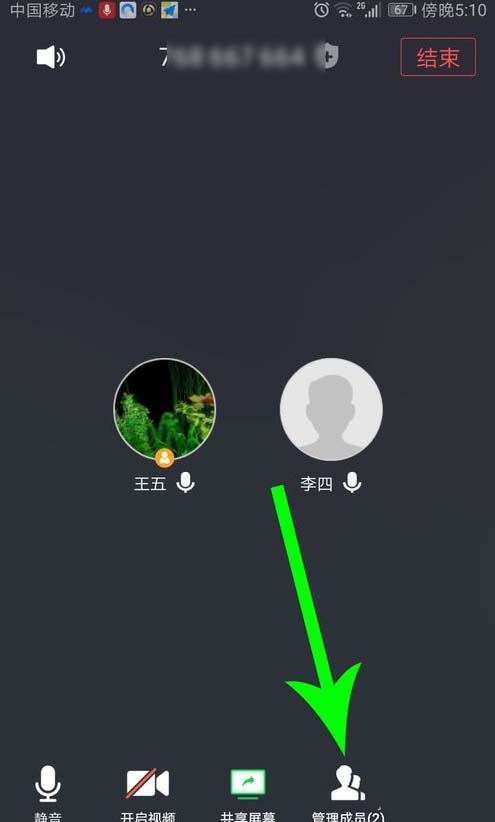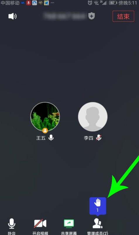 1,主持人打开开会界面点击“管理成员”,然后点击“全体静音”。