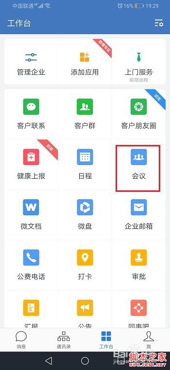 第二步进去企业微信之后,点击工作台,选择会议,如下图所示: