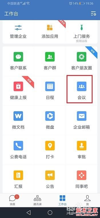第一步手机上打开企业微信,进去工作台之后,点击会议,如下图所示: