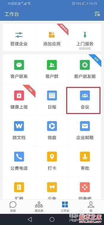 第一步打开企业微信,进去工作台,点击会议,如下图所示: