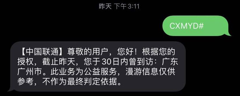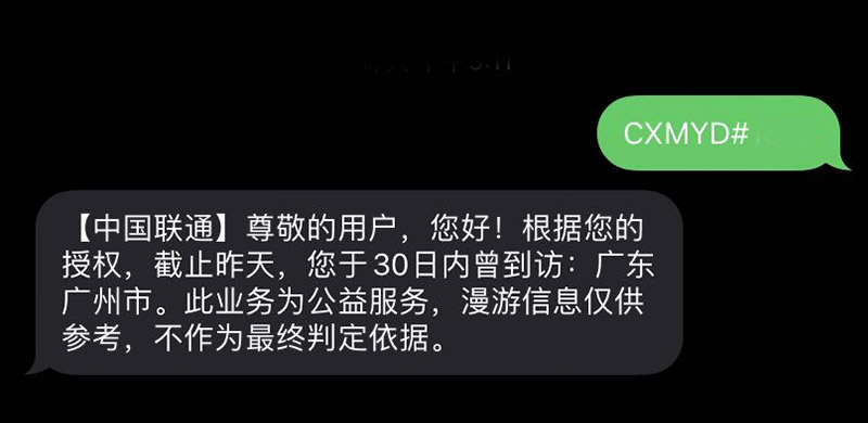 联通手机用户证明方法:编辑短信“CXMYD#身份证后四位”到10010,查询近30天的全国漫游地信息。