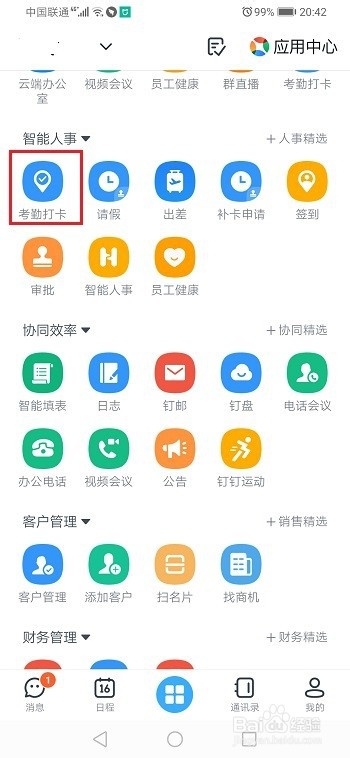 第一步手机上打开钉钉,进去工作台,选择考勤打卡,如下图所示:
