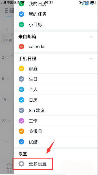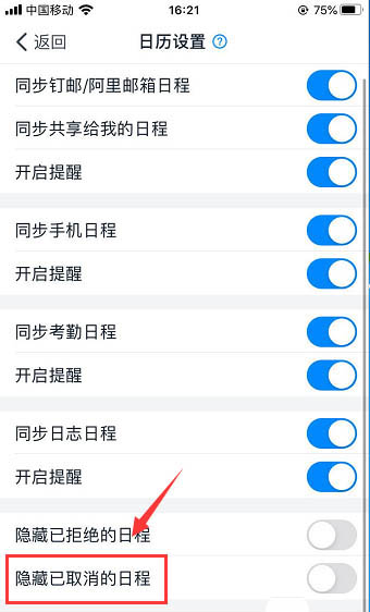 4、进入日历设置页面,在最下方可以看到隐藏已取消的日程,如下图