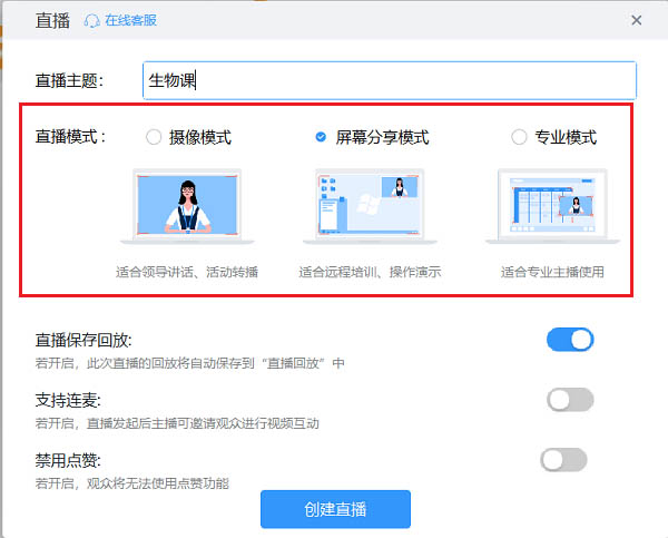2、摄像模式适合领导讲话,屏幕分享模式适合上课,培训,专业模式适合专业主播,如下图所示: