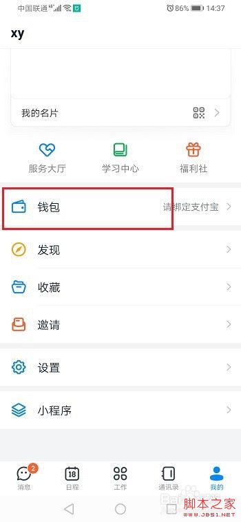 第一步手机上打开钉钉,进去我的界面,点击钱包,如下图所示: