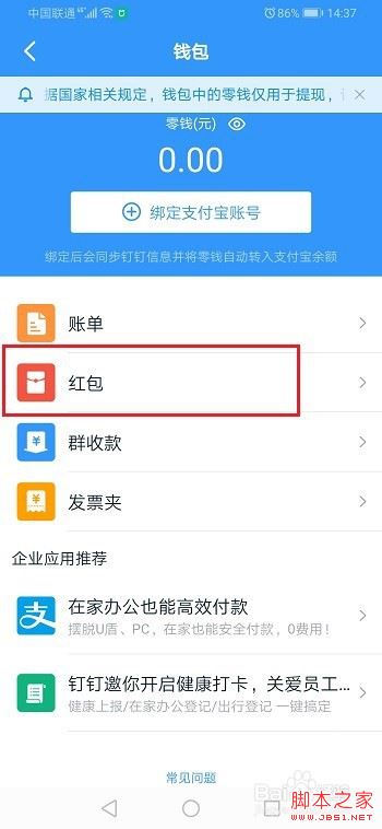 第二步进去钉钉钱包之后,点击红包,如下图所示: