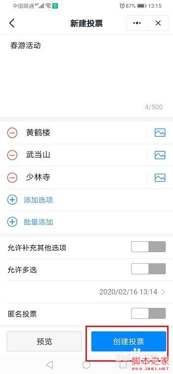 第三步进去之后,输入投票内容和选项,点击创建投票,如下图所示: