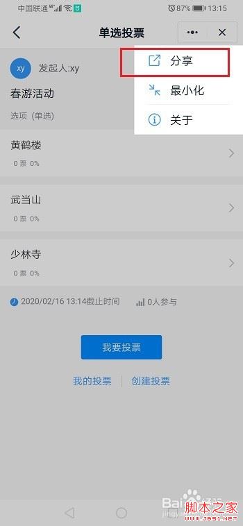 第四步创建投票之后,点击三点图标,选择分享到钉钉群里面,如下图所示: