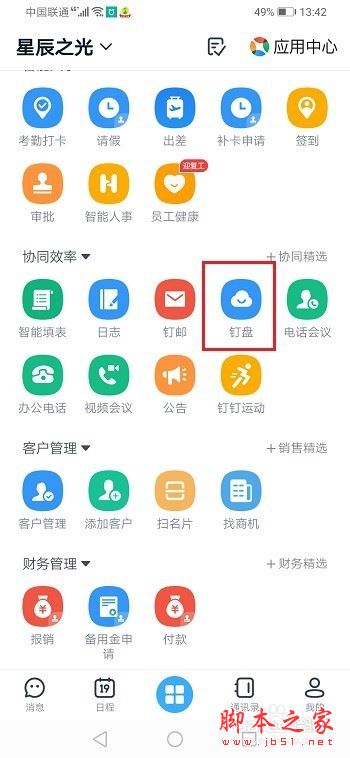 第一步手机上打开钉钉,进去工作台,点击钉盘,如下图所示: