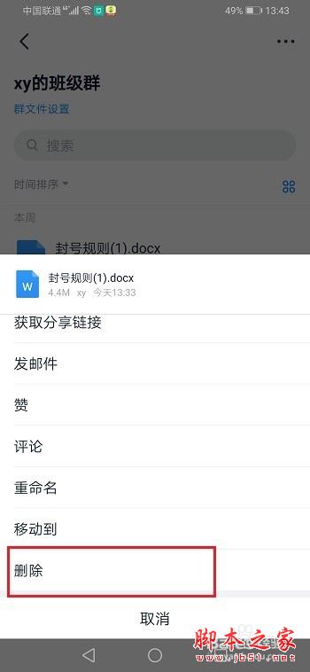 第五步选择文件旁边的三点图标,点击删除,可以删除文件,释放钉盘容量,如下图所示: