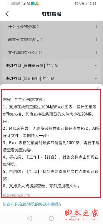 第一步我们首先知道钉钉是支持在线预览excel,ppt,word,pdf等文件的,如下图所示: