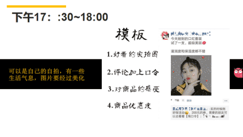 目的:大家在下班路上,这个时候的人们心情比较放松,这个时间点大家都会有冲动型的购物!尤其是女性的!所以你的买家秀,然后评论放上口令,这样就会很容易出单子了!