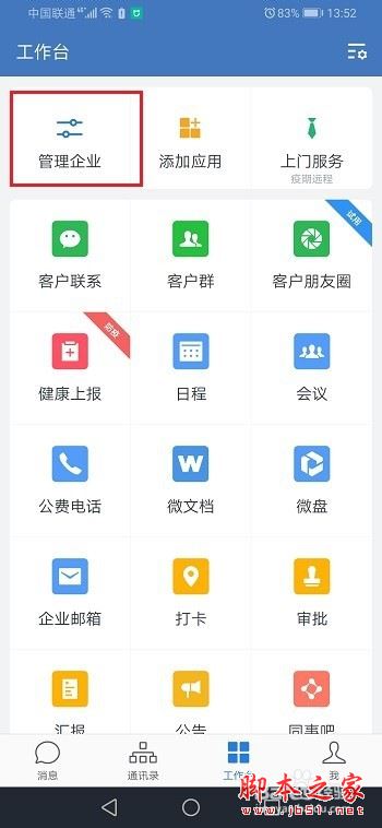第一步手机上打开企业微信,进去工作台,点击管理企业
