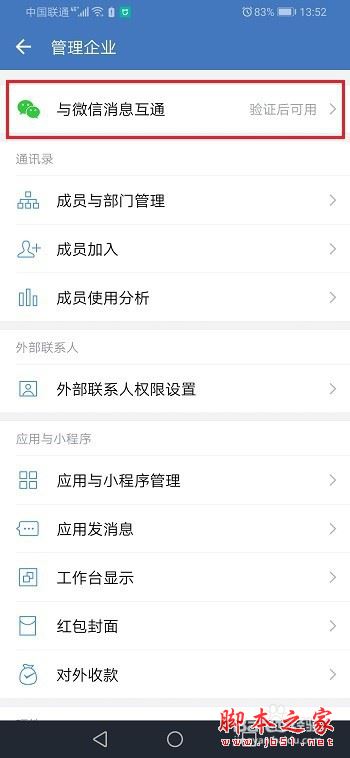 第二步进去管理企业之后,点击与微信消息互通