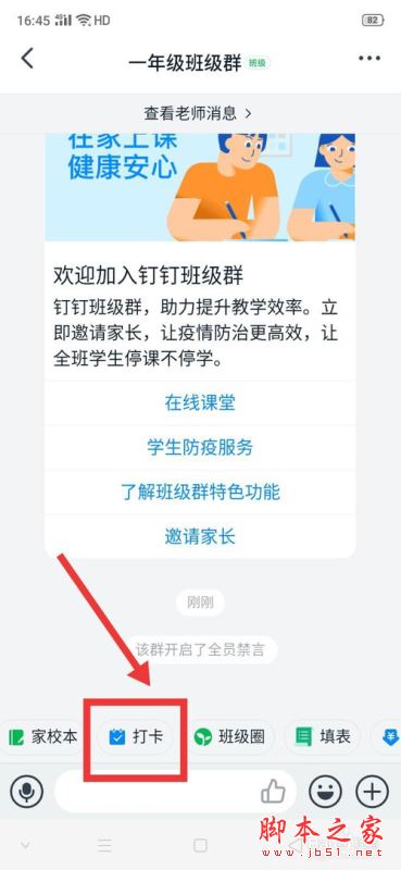 打开钉钉,进入班级群,点击右下方的【打卡】。
