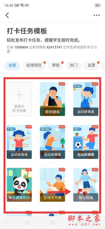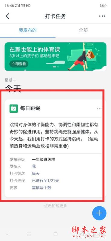 点击后,可以选择打卡任务模板,也可以自定义打卡任务,比如选择【每日跳绳】打开任务。