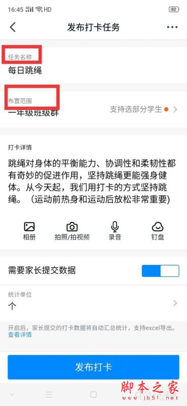 选择后,编辑【任务名称】、【布置范围】、【是否允许家长补卡】和【打开周期】等等。
