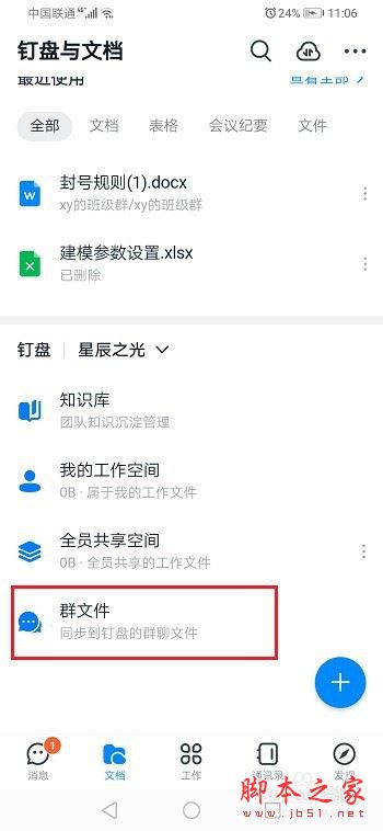 第一步手机上打开钉钉,进去文档页,点击群文件,如下图所示: