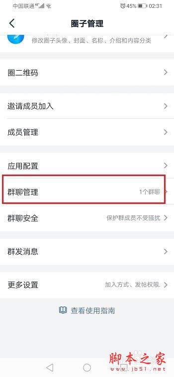 第三步在圈子管理界面,点击群聊管理,如下图所示: