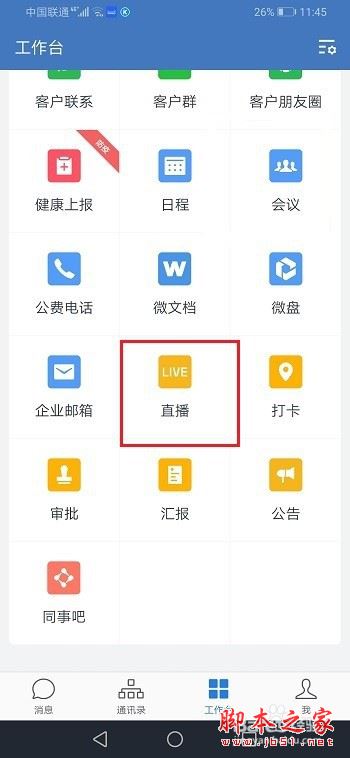 第一步手机上打开企业微信,进去工作台,点击直播,如下图所示: