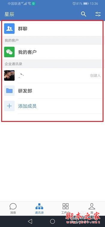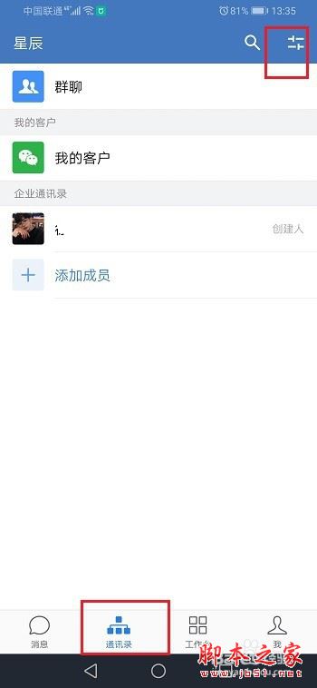第二步进去企业微信通讯录界面之后,点击右上方的图标,如下图所示: