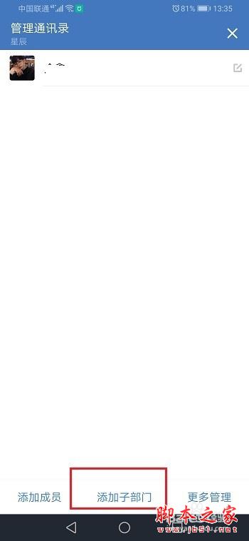第三步进去管理通讯录界面,点击底部的添加子部门,如下图所示: