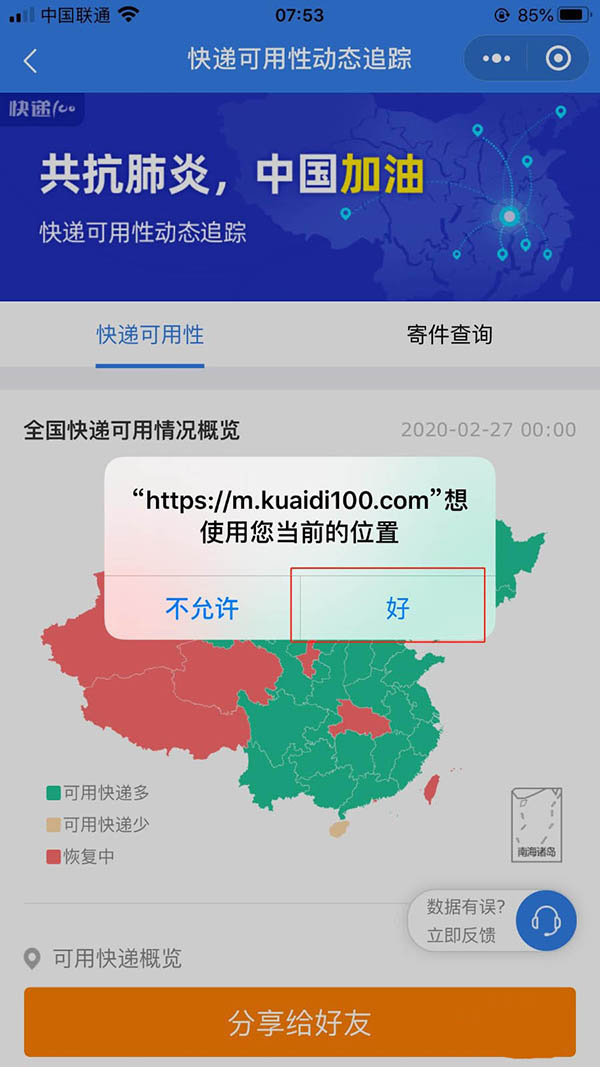 4、根据提示允许获取当前定位。