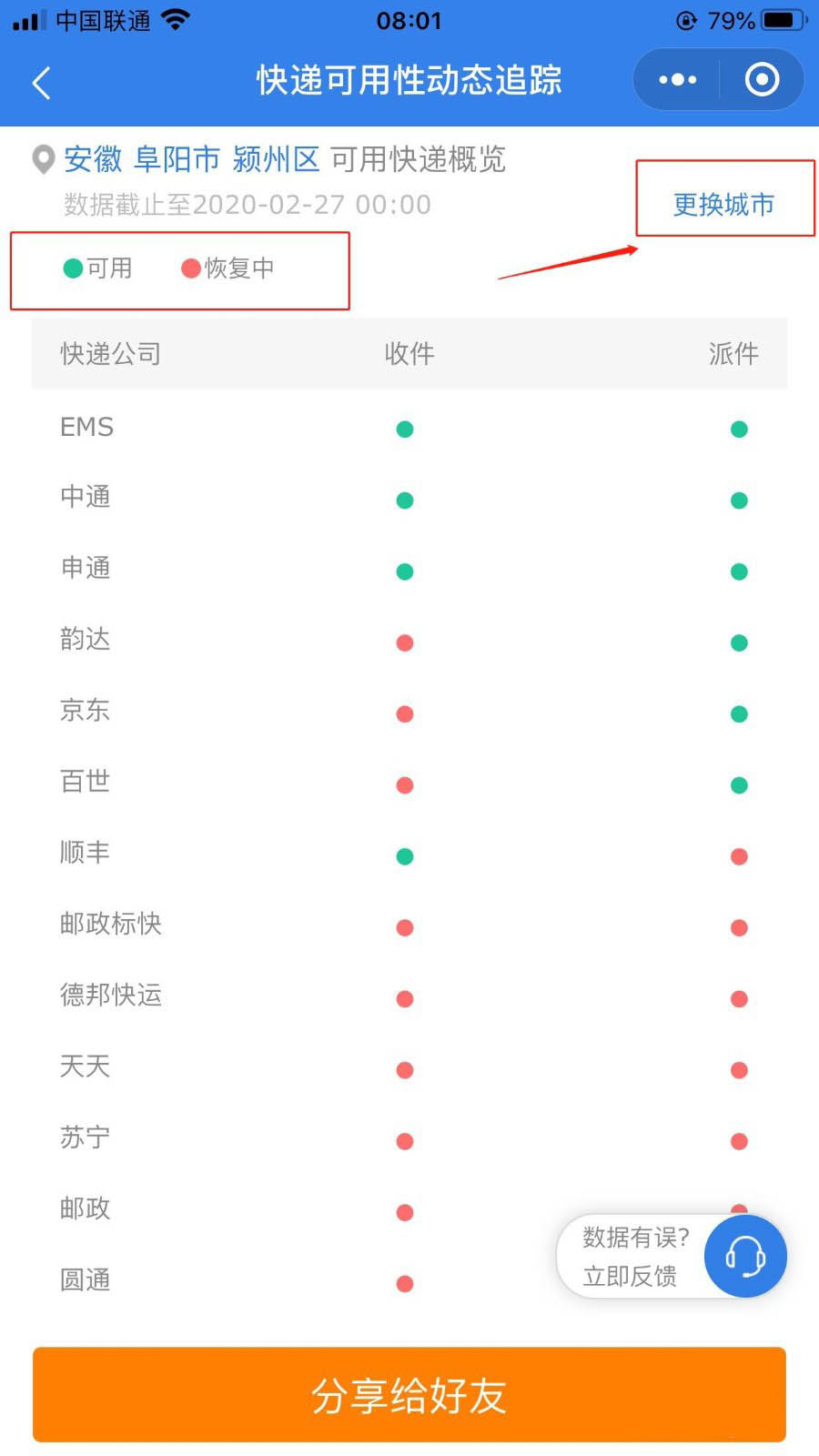 5、绿色原点表示当前定位城市可用快递收派件情况。