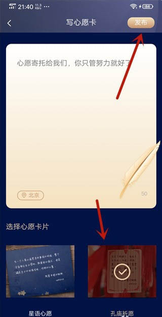 5、然后下面点击一个心愿卡片选中,点击【发布】按钮。