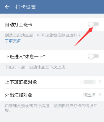 6、点下自动打卡上班开启按钮就完成设置了,如图