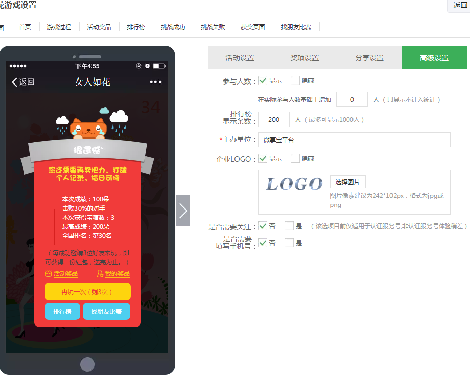 4.最后的部分是活动设置和奖项设置,这两个部分,图片的地方是在左侧手机模拟器中鼠标移动过去进行修改的,奖项设置部分我们可以选择一个或者多个都是可以的,最后在高级设置中我们可以设置关注公众号和活动logo图片;