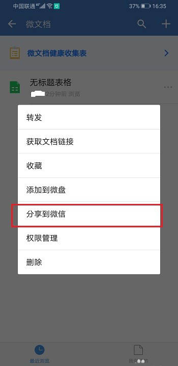 2、在微文档界面,选择要分享的文件,点击三点图标,如下图所示: