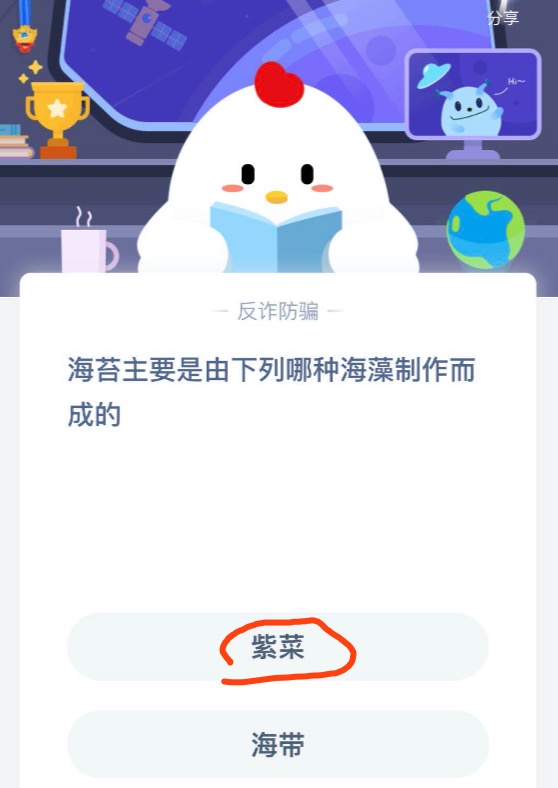海苔主要是由下列哪种海藻制作而成的?想必很多朋友都想知道支付宝蚂蚁庄园今日答题答案,正确回答就可以领取180g饲料喂养小鸡哦 。下文中为大家带来了正确答案,感兴趣的朋友快来了解一下吧。
