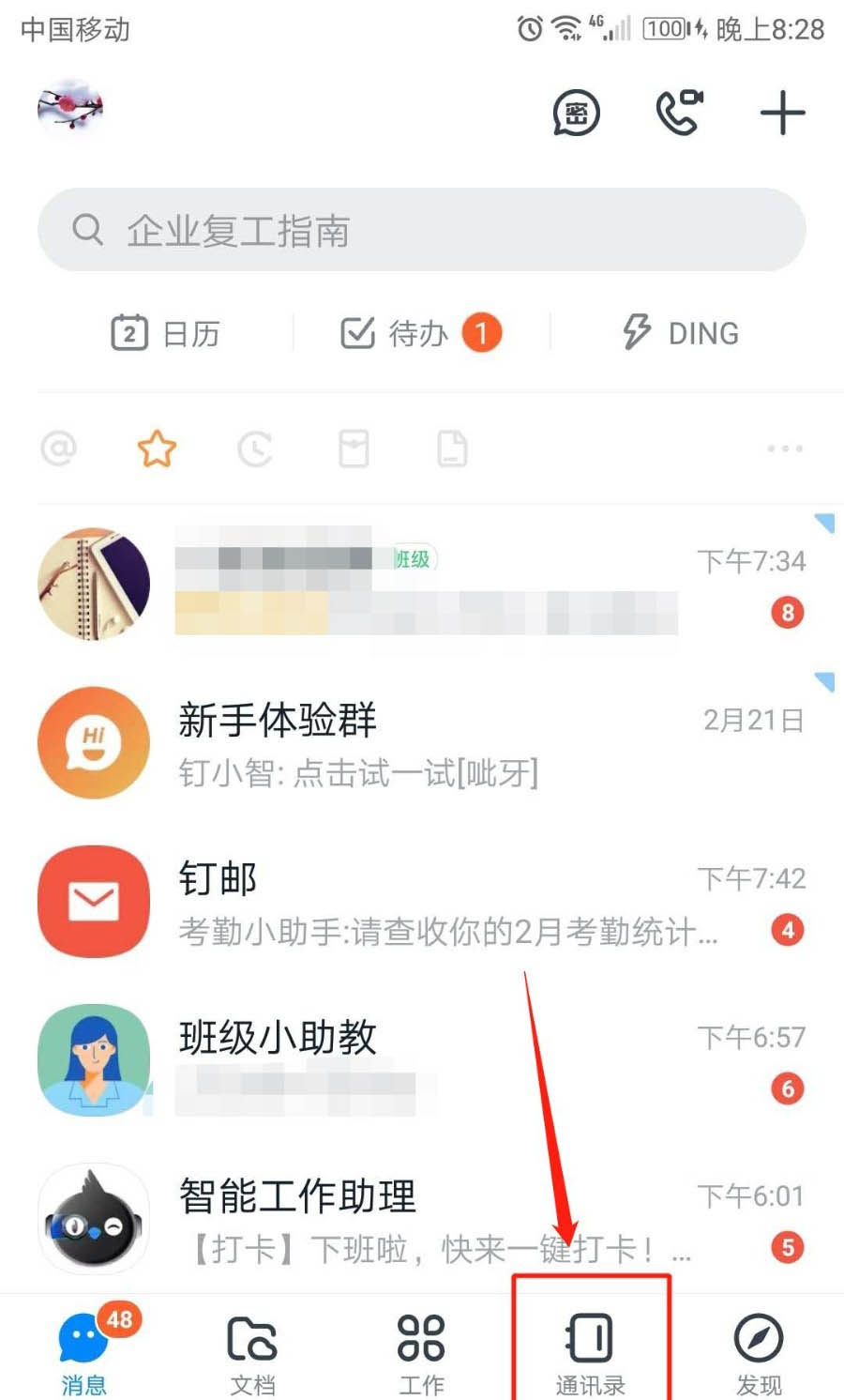 1、运行手机钉钉APP,成功登录钉钉后,点击“通讯录”选项卡。