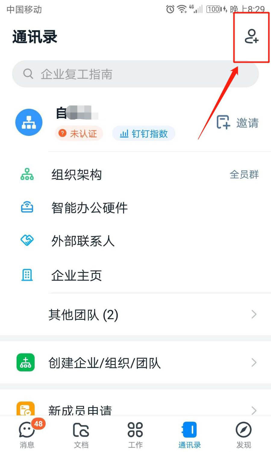 2、在通讯录界面,点击右上角添加图标。