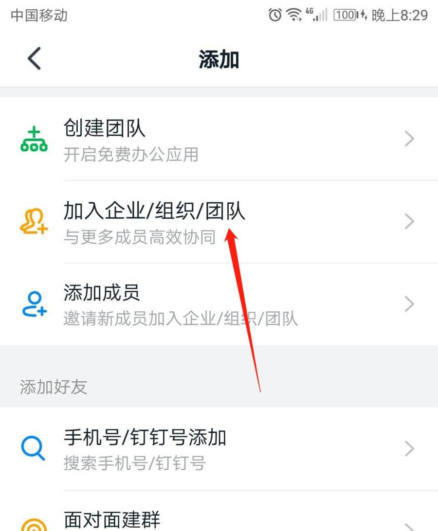 3、在“添加”界面,点击“加入企业/组织/团队”。