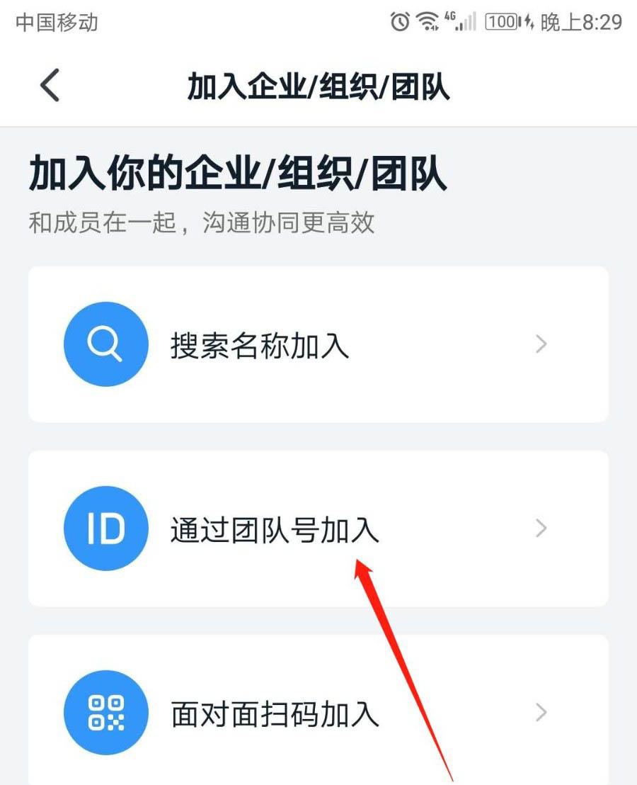 4、在“加入企业/组织/团队”界面,选择加入方式,我们选择“通过团队号加入”。