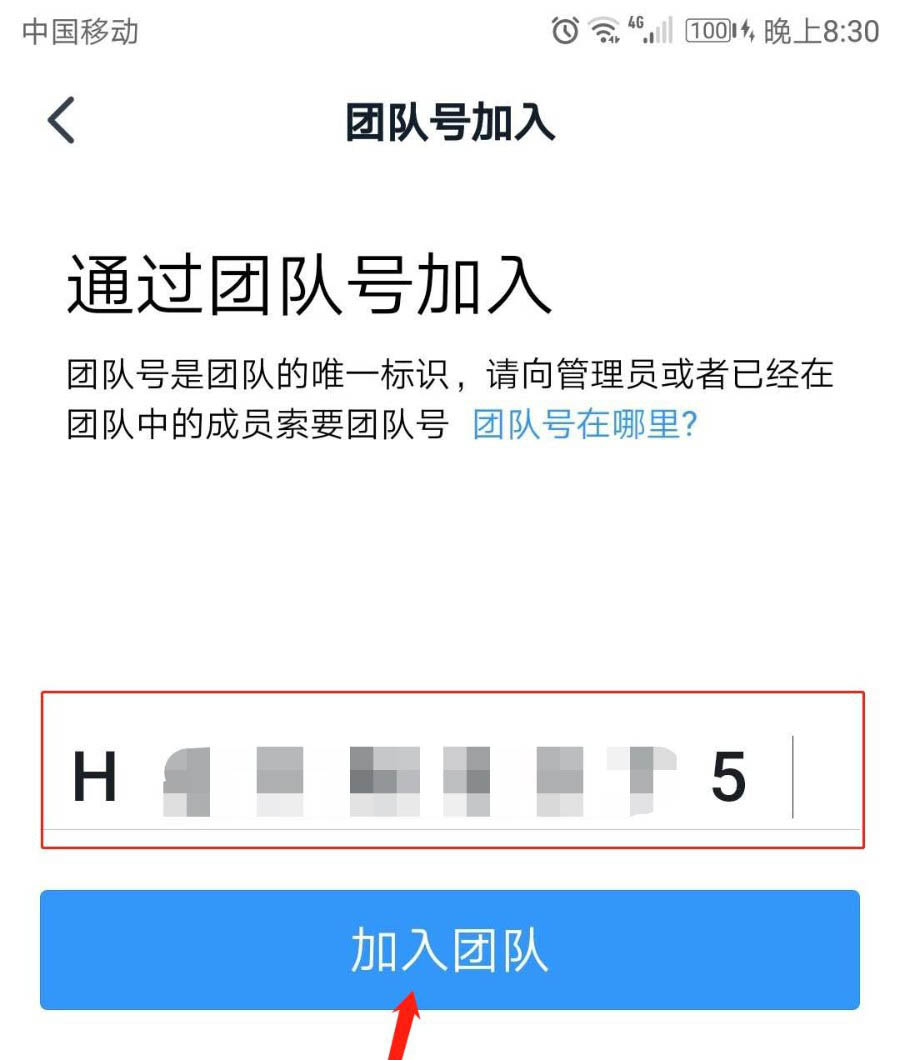 7、输入团队号,点击“加入团队”。