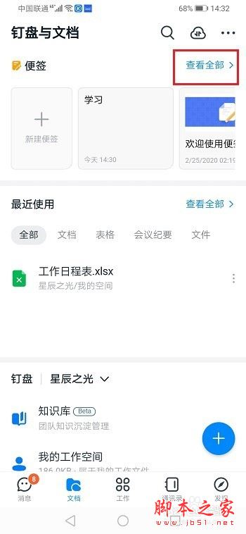 第一步手机上打开钉钉,进去文档页,点击便签的查看全部,如下图所示: