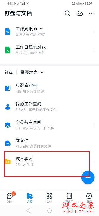 第一步手机上打开钉钉,进去文档页,点击+号图标,如下图所示: