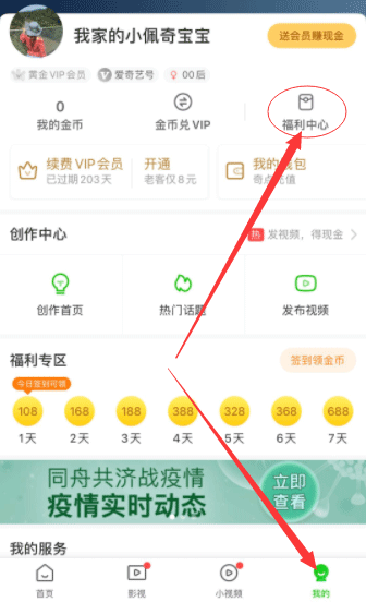 ①首先去各大手机商店下载爱奇艺极速版,手机号登录后,你会在右下角看到【我的】点击一下,这时你会看到右上角有个【福利中心】点击进去即可。