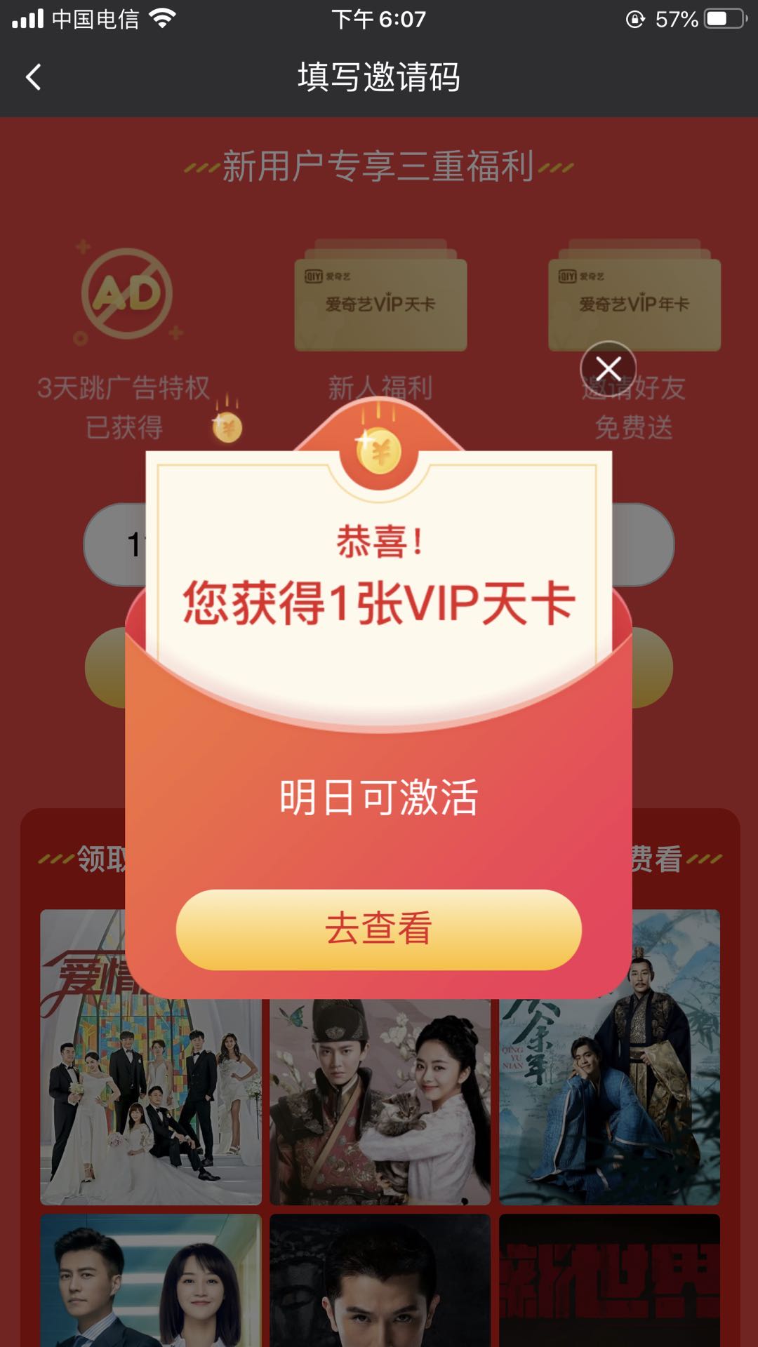此时我们已经成功的输入爱奇艺极速版邀请码【2923379715或253797573】了,您只需要激活爱奇艺VIP天卡即可。步骤如下: