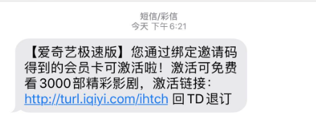 即可激活爱奇艺VIP天卡,你会收到如下短信,以证实你的爱奇艺会员激活了。